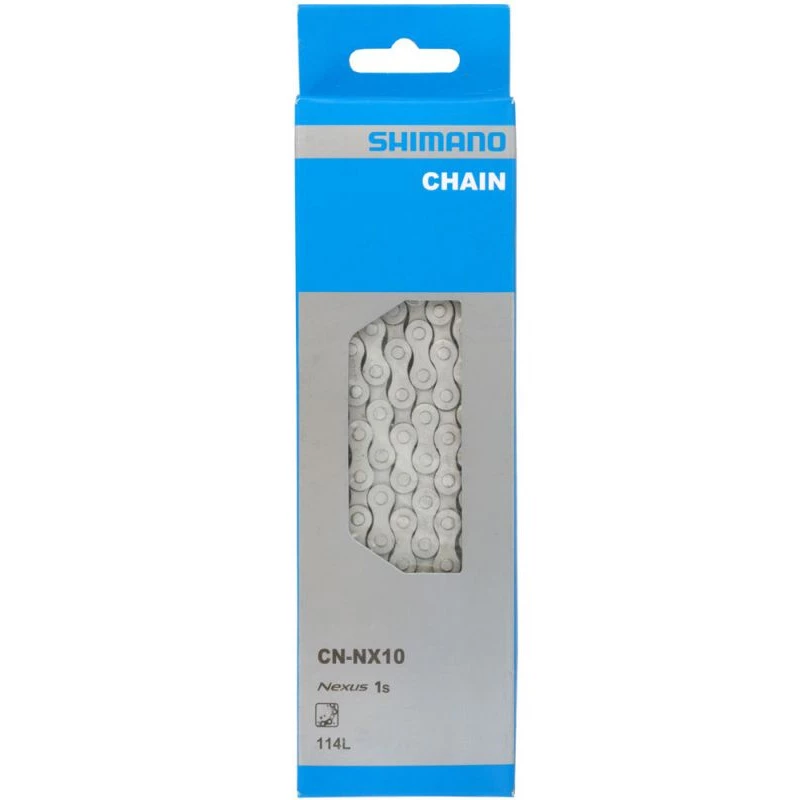 La chaîne Shimano CN-NX10 convient aux moyeux à engrenages Nexus ou aux roues à une vitesse et offre une durabilité accrue grâce à un revêtement résistant à la corrosion
