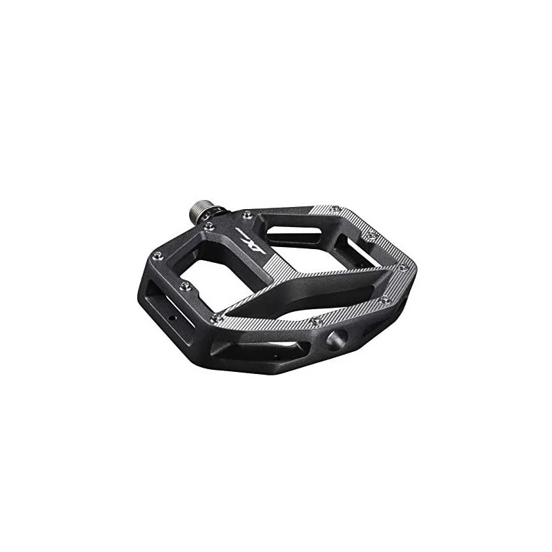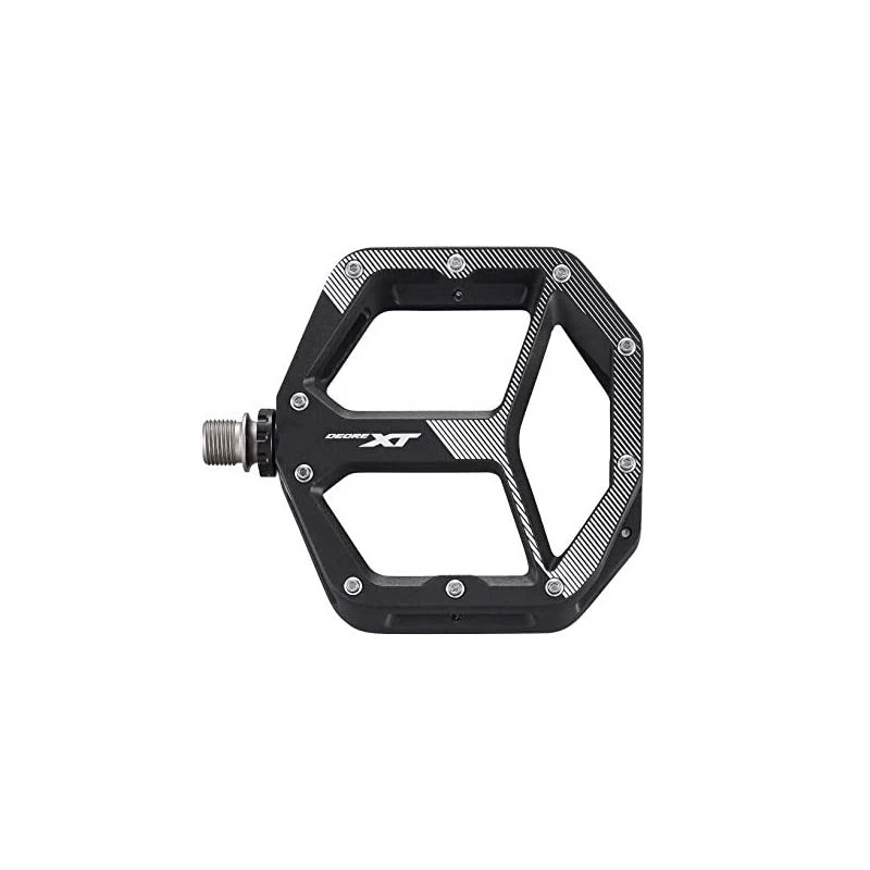 Pédales plates Shimano avec plateformes, larges pour plus de stabilité et de confort et une position optimisée des broches pour un bon grip.